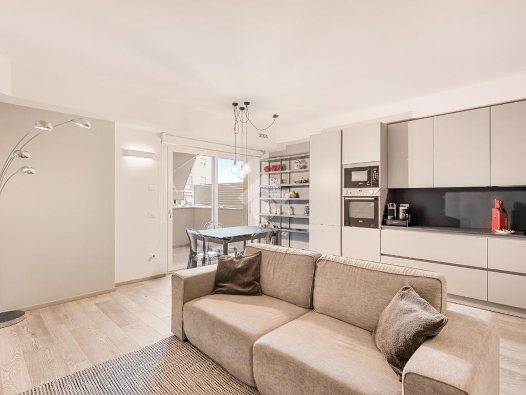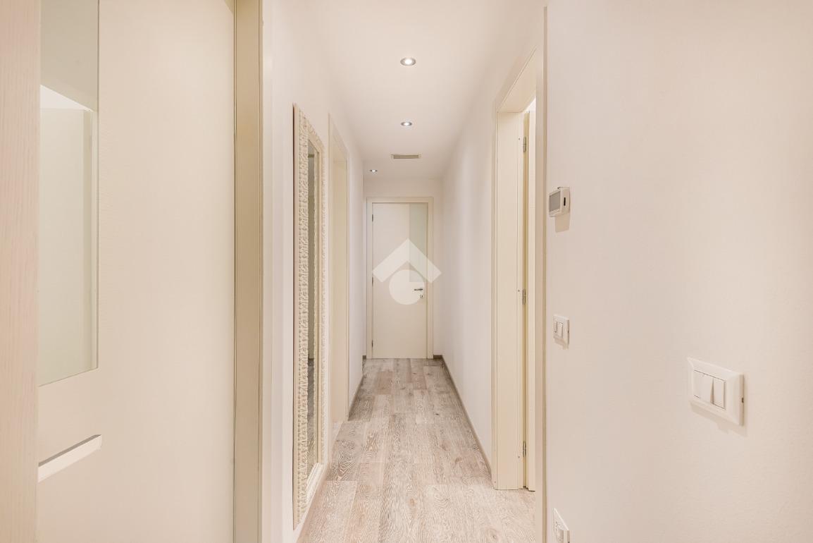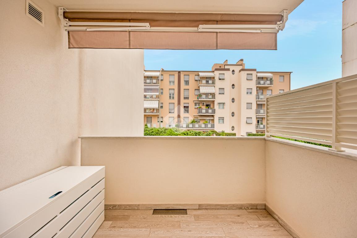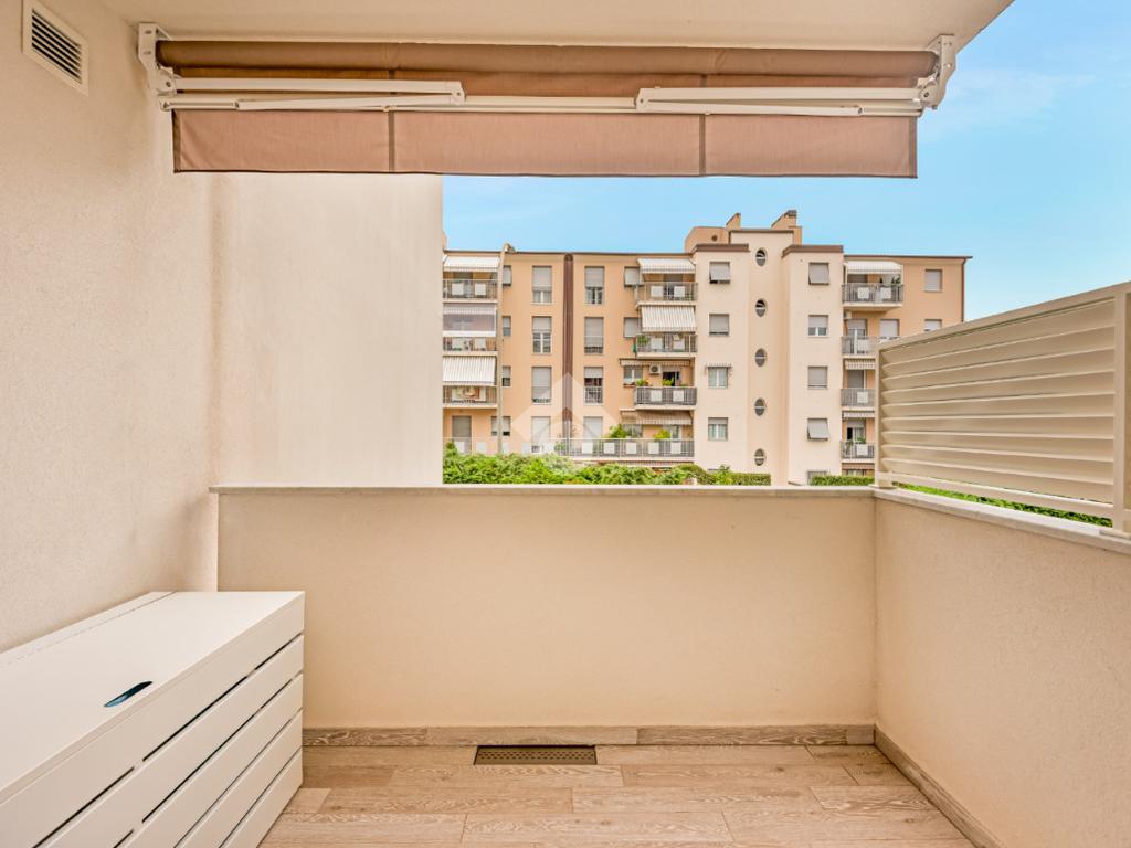 tramite portone blindato si accede alla zona giorno open space dotata di ampio balcone pranzabile, un corridoio divide la zona notte composta da due camere da letto entrambe con accesso al balcone, nel quale è stato dedicato uno spazio lavanderia ed è dotato di tenda elettrica; troviamo poi due bagni completi dotati di box doccia e un comodo ripostiglio con scarico per la lavatrice.