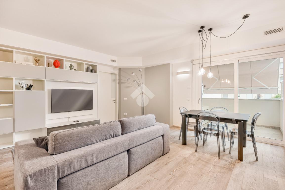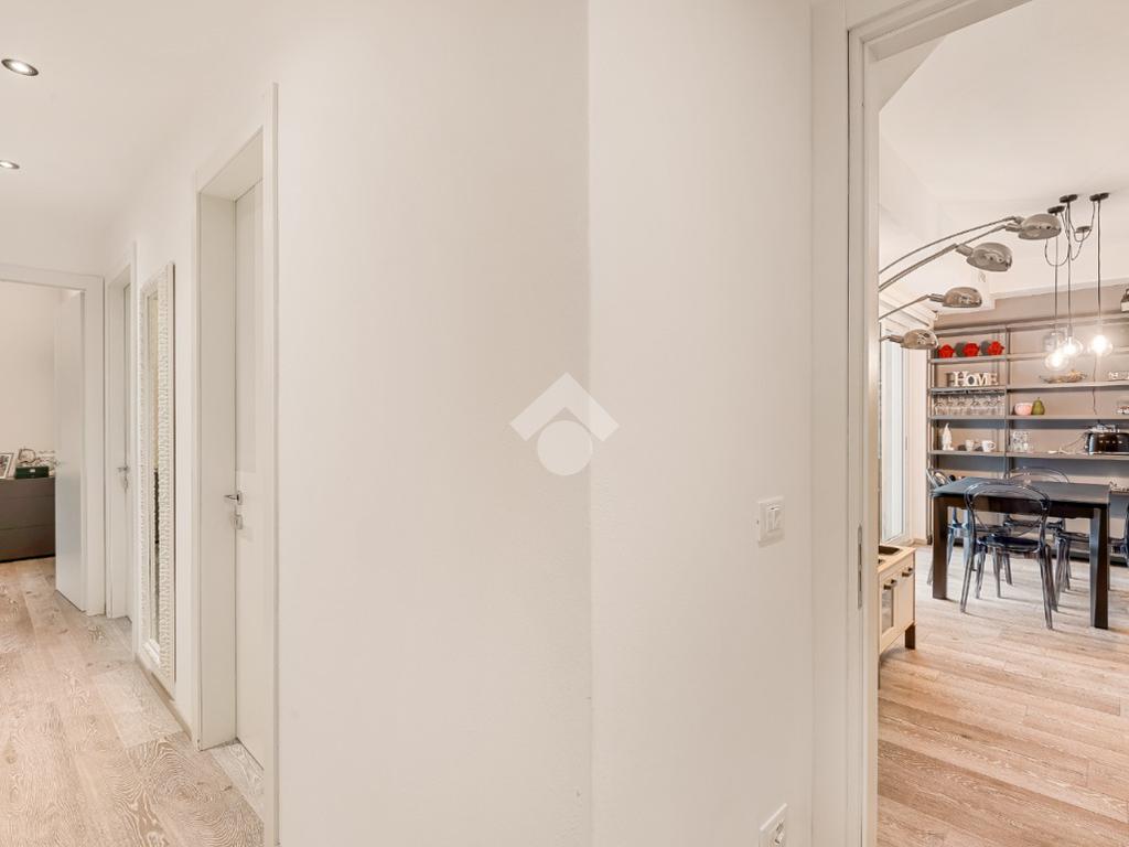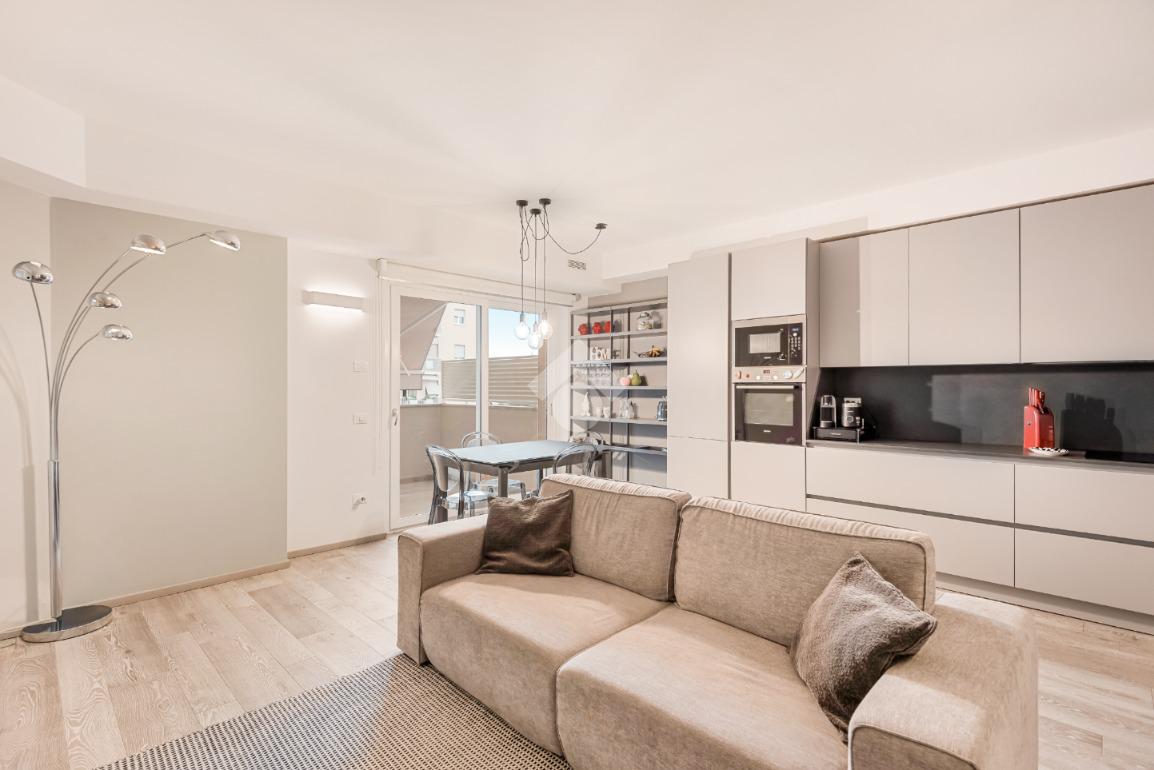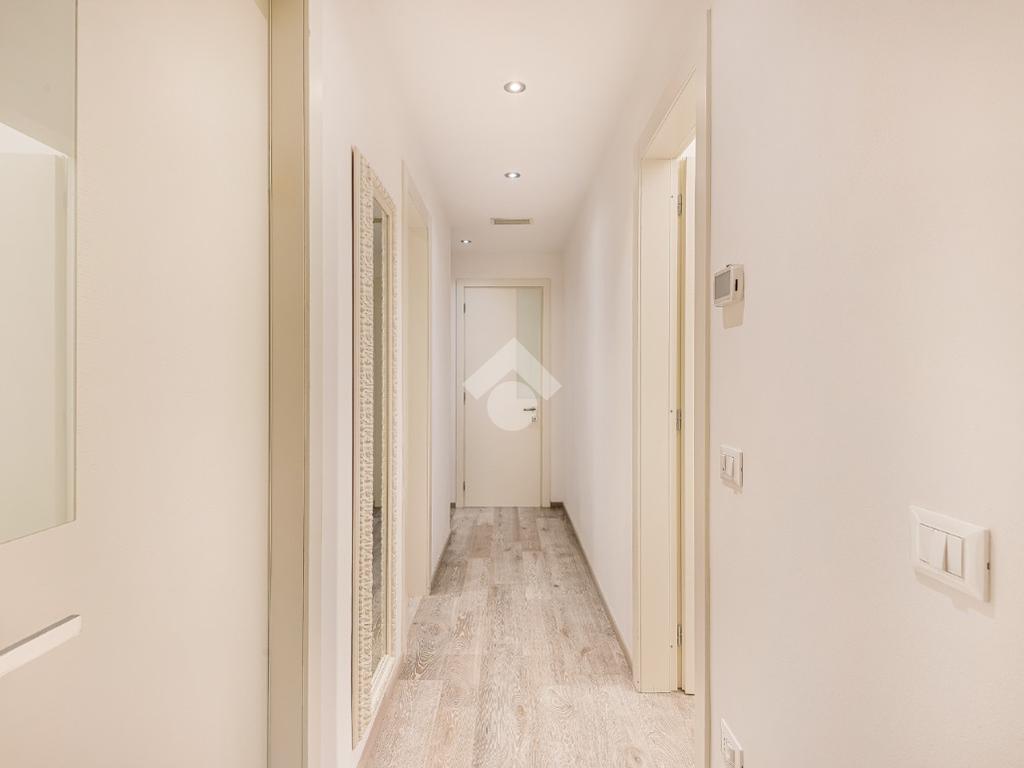 tramite portone blindato si accede alla zona giorno open space dotata di ampio balcone pranzabile, un corridoio divide la zona notte composta da due camere da letto entrambe con accesso al balcone, nel quale è stato dedicato uno spazio lavanderia ed è dotato di tenda elettrica; troviamo poi due bagni completi dotati di box doccia e un comodo ripostiglio con scarico per la lavatrice.