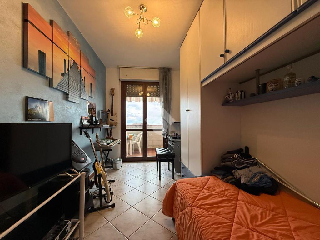 L'ingresso è nel disimpegno che da una parte affaccia nel grande soggiorno e dall'altra ci porta in corridio dove troviamo subito la cucina abitabile con balcone. Proseguendo per il corridoio abbiamo il primo bagno con doccia, due camerette singole entrambe con accesso a un secondo balcone, camera matrimoniale e il secondo bagno con vasca. Completa l'immobile un ampio garage, all'interno dell'area condominiale sono presenti posti auto non assegnati.